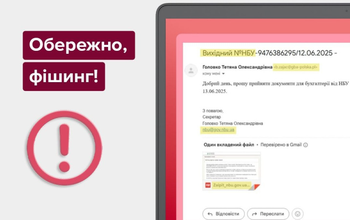 Сьогодні, 12 червня, була зафіксована масштабна фішингова кампанія з розсилання електронних листів, які містять шкідливі вкладення. Зловмисники імітують офіційні повідомлення від Національного банку, використовуючи схожу тему листа та назву прикріпленого файлу. Про це повідомляє «Мінфін» з посиланням на пресслужбу НБУ.