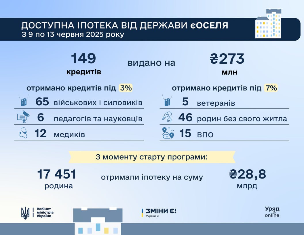 З моменту її старту урядової програми іпотеки «єОселя» у жовтні 2022 року вже 17 451 українська родина скористалися можливістю придбати житло на пільгових умовах. Загальна сума виданих кредитів за цей час становить понад 28,8 млрд грн. Про це йдеться у повідомленні пресслужби Кабміну.
