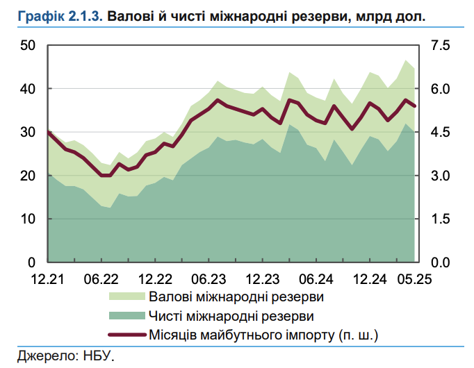 «Швидше надходження коштів від партнерів дає змогу нарощувати міжнародні резерви. На початку червня вони становили $44.5 млрд, прогноз НБУ на кінець року — близько $58 млрд. Обидва показники помітно перевищують необхідний їх рівень за композитним критерієм МВФ. Водночас накопичений цьогоріч рівень резервів очікувано знизиться надалі», — зазначає регулятор.