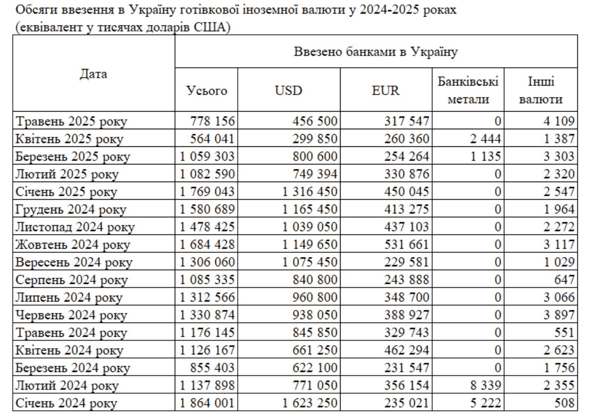 Обсяг готівкової іноземної валюти, яку банки ввезли в Україну в травні 2025 року, становив $778 млн. Це на 38% більше, ніж у квітні ($564 млн).