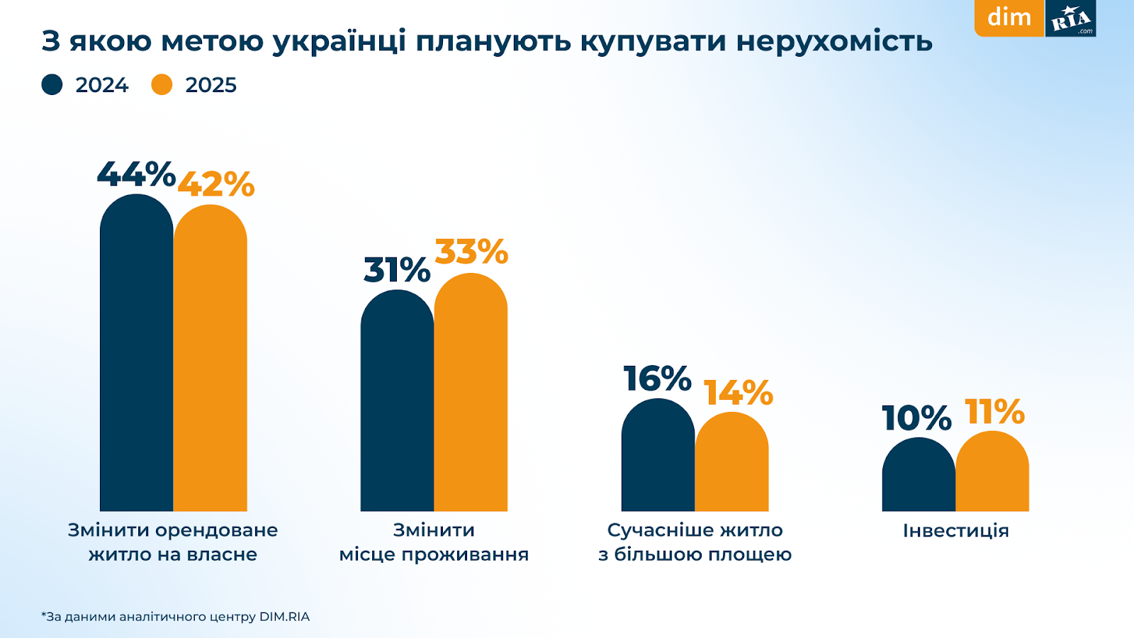 Дві найпоширеніші мети для купівлі житла серед опитаних користувачів маркетплейсу — змінити орендоване житло на власне (42%) та змінити місце проживання (33%).