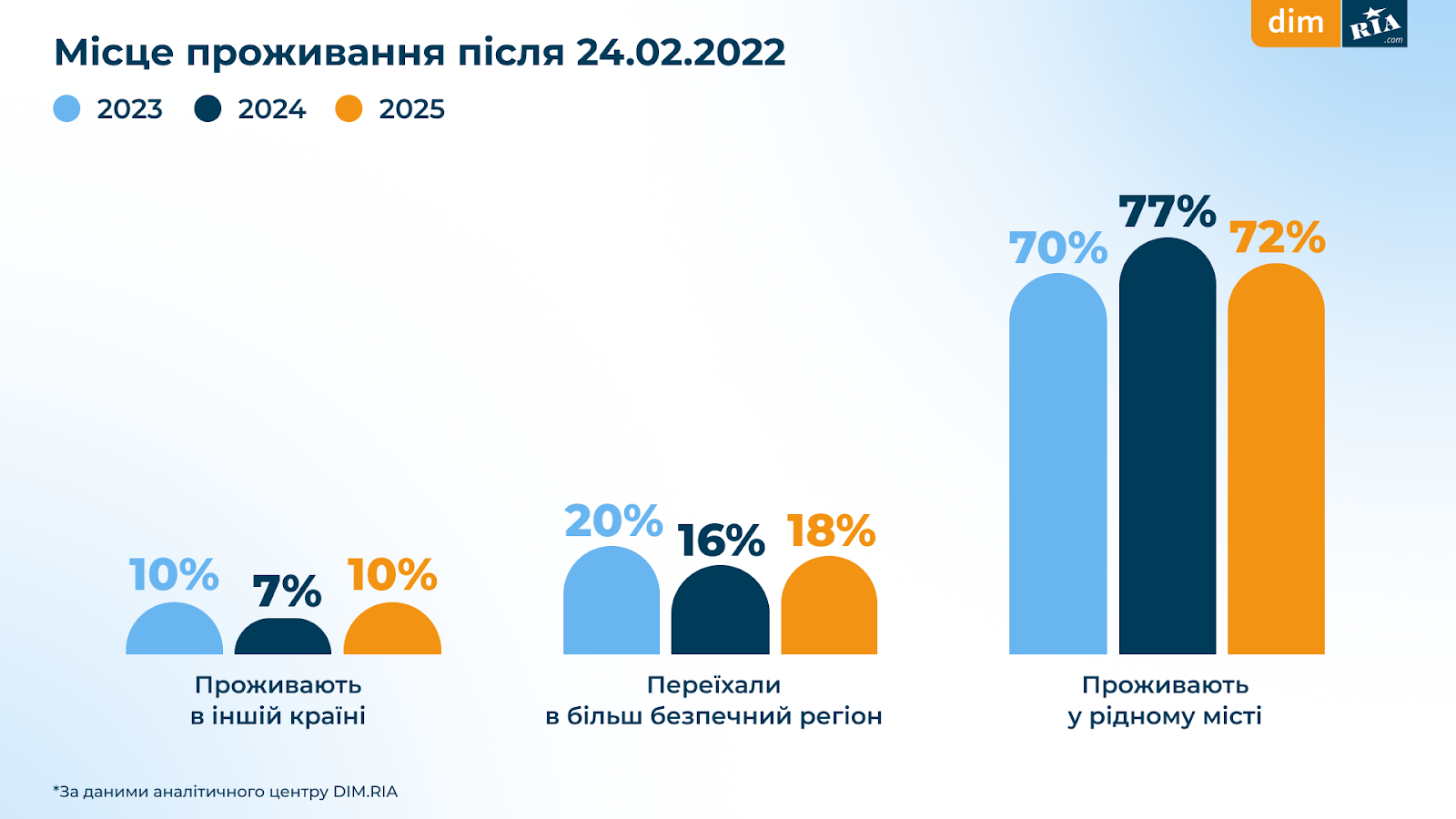 У 2025 році більшість українців продовжують жити у рідних містах. Однак частка тих, хто переїжджає у безпечніші регіони та за кордон, зросла у порівнянні з 2024 роком.