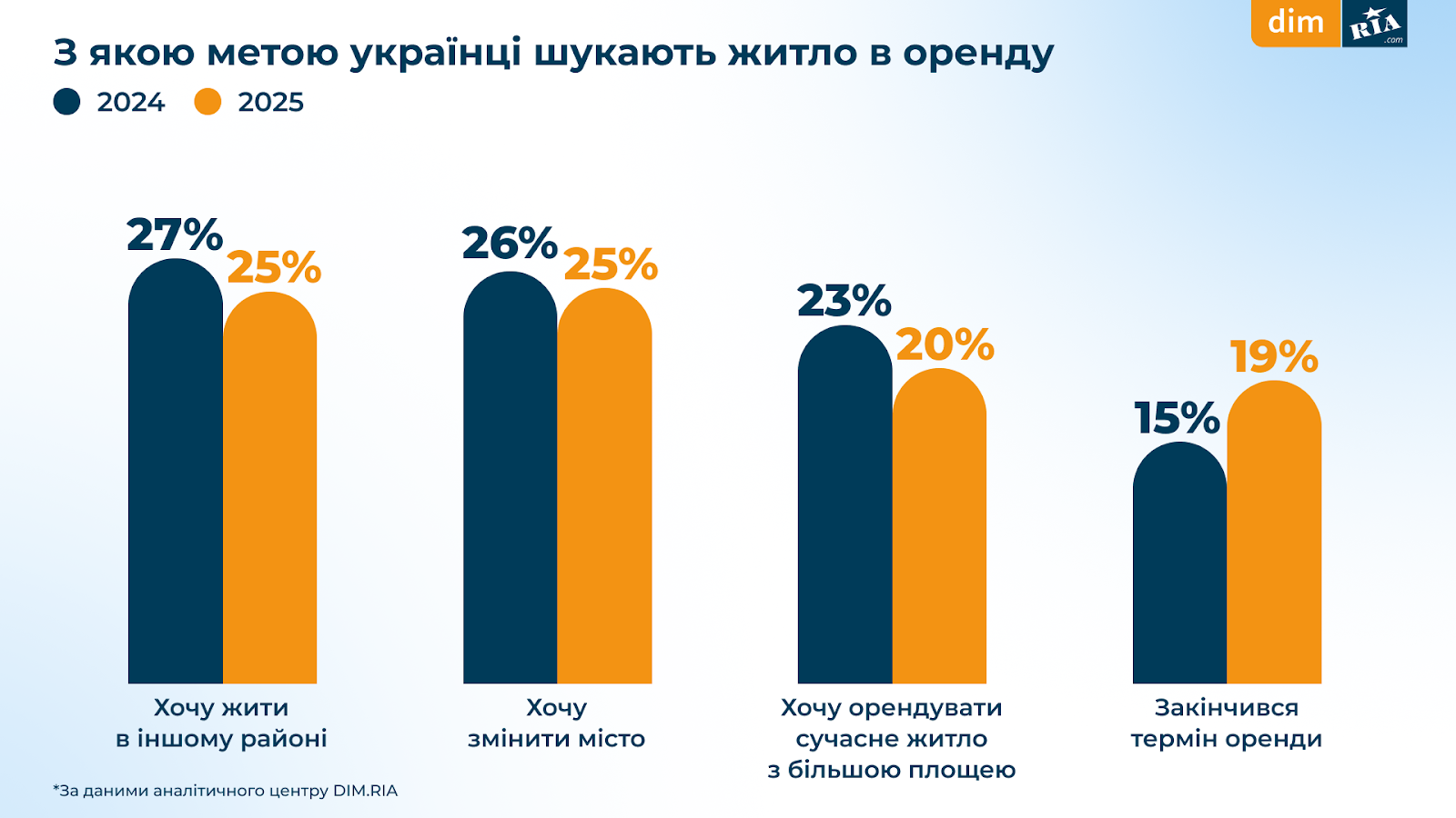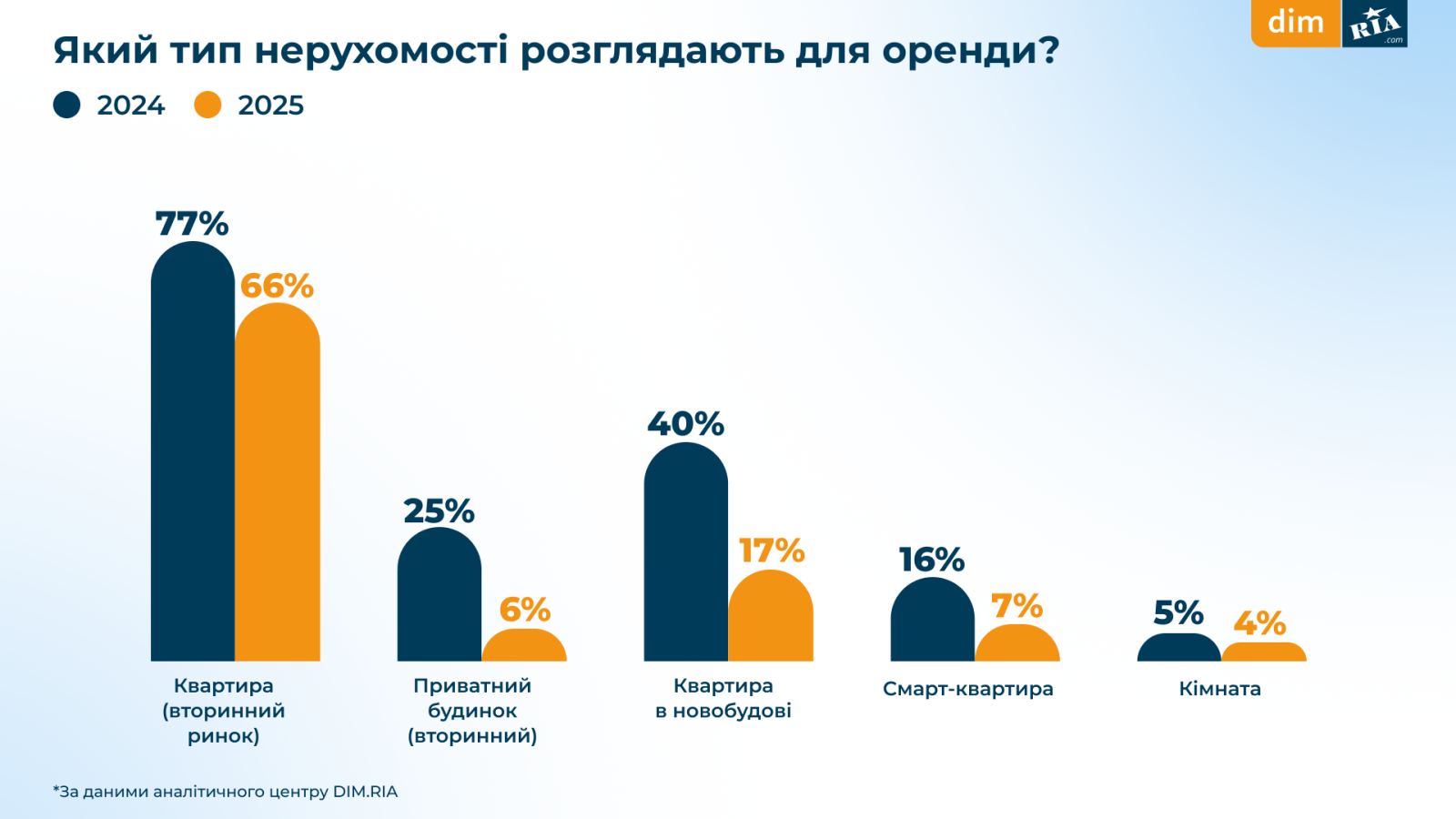 Основна причина для пошуку орендованого житла — зміна міста або району проживання. Уподобання в оренді збігаються з планами на купівлю: лідером є квартири на вторинці. Наступними серед варіантів є новобудови та смарт-квартири.