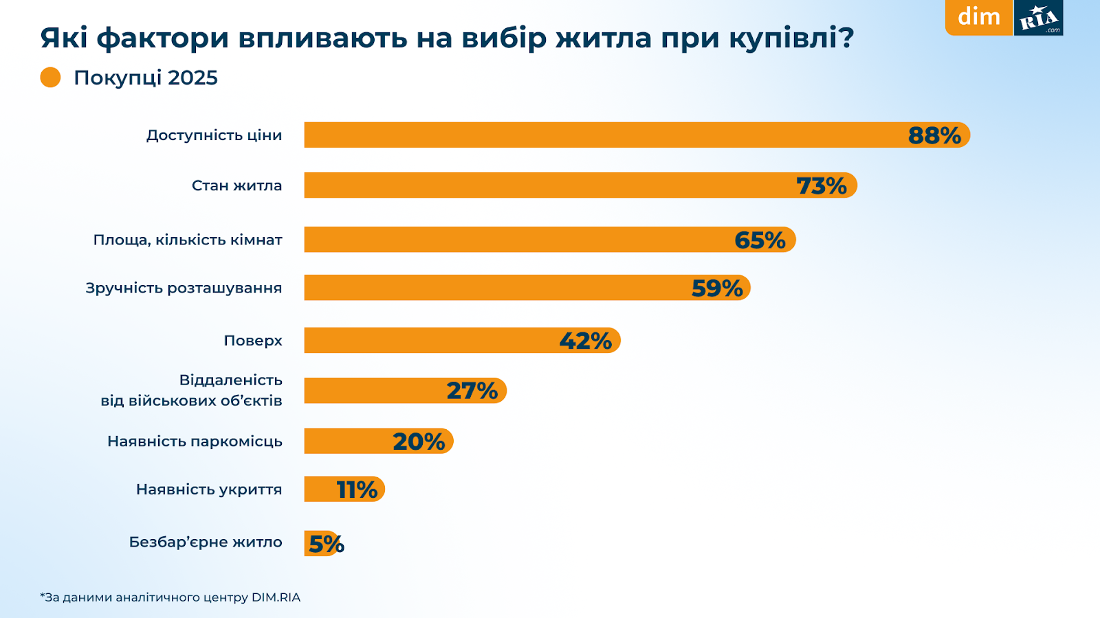 Серед пріоритетів, за якими українці обирають житло для купівлі, на перший план виходять доступна ціна, стан об'єкта, площа та зручність розташування.