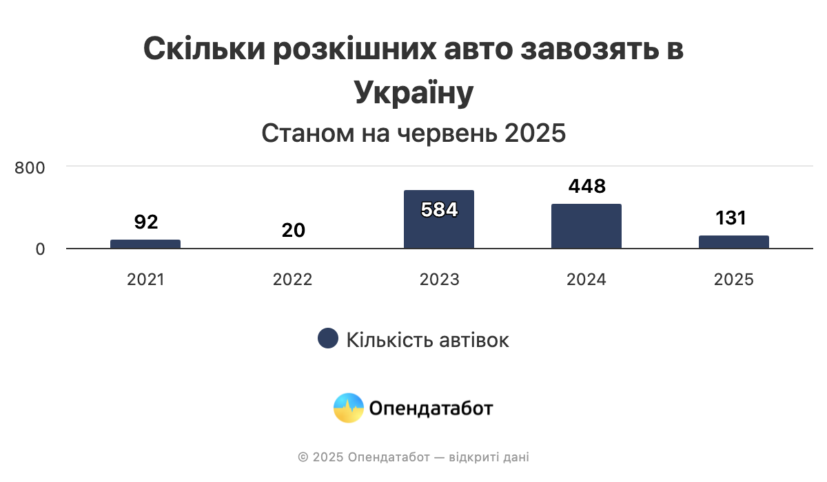 Різке зростання кількості авто, яке додатково оподатковується, сталося 2023 року. Тоді за 5 місяців в Україну завезли 584 авто, що підпадали під податок на розкіш.