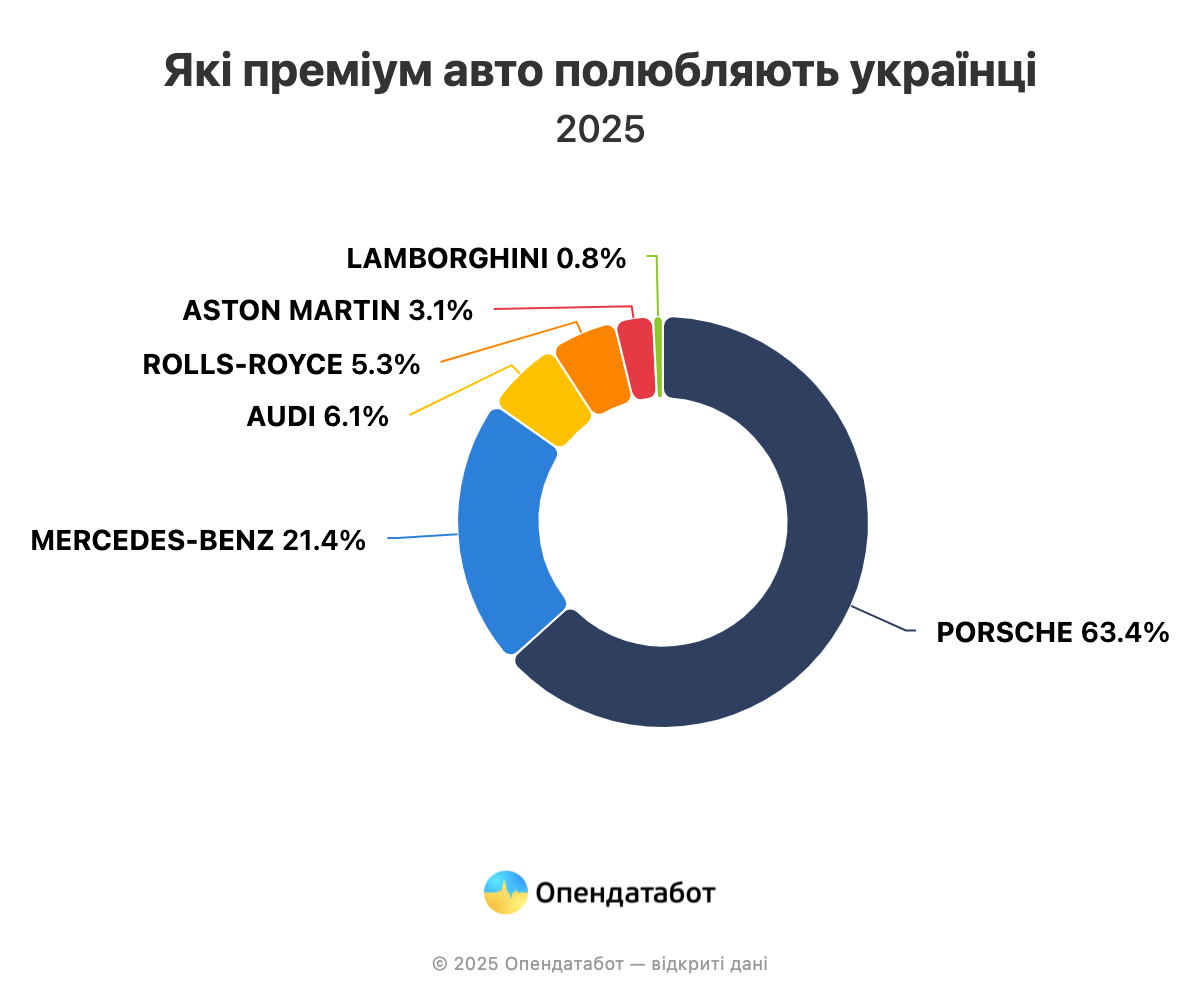 63% усіх завезених в Україну авто, які підлягають податку на розкіш, цьогоріч — це Porsche. Зокрема, популярні Porsche Taycan та Porsche Cayenne E-hybrid — 41% та 8% від усіх авто відповідно.
