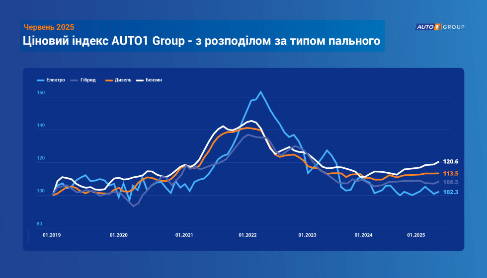 Бензинові автомобілі: Найвищі ціни серед усіх типів авто. Індекс у червні досяг 120,6. Порівняно з січнем, ціни зросли на 7,4%, а у порівнянні з червнем 2024 року — на 8,2%.