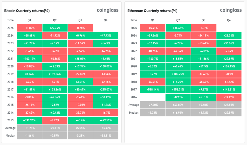 Другий квартал 2025 року виявився прибутковим для криптовалют з найбільшою капіталізацією. Біткоїн подорожчав майже на 30%, Ethereum — на 36%. Про це свідчать дані Coinglass.