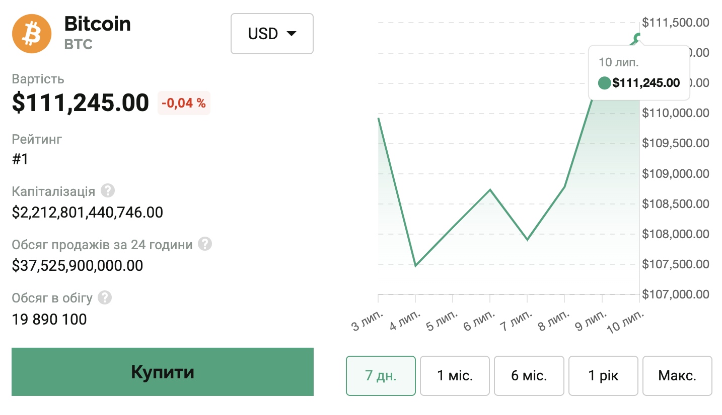 Згідно із даними інтерактивної таблиці «Мінфіну», вартість першої криптовалюти станом на 07:00 10 липня становить $111,245 за монету.