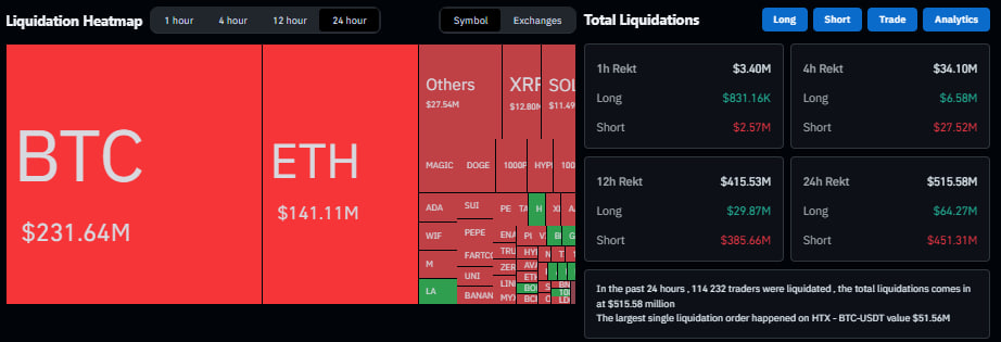 Обсяг ліквідацій перевищив $515 мільйонів на тлі досягнення біткоїном нового максимуму