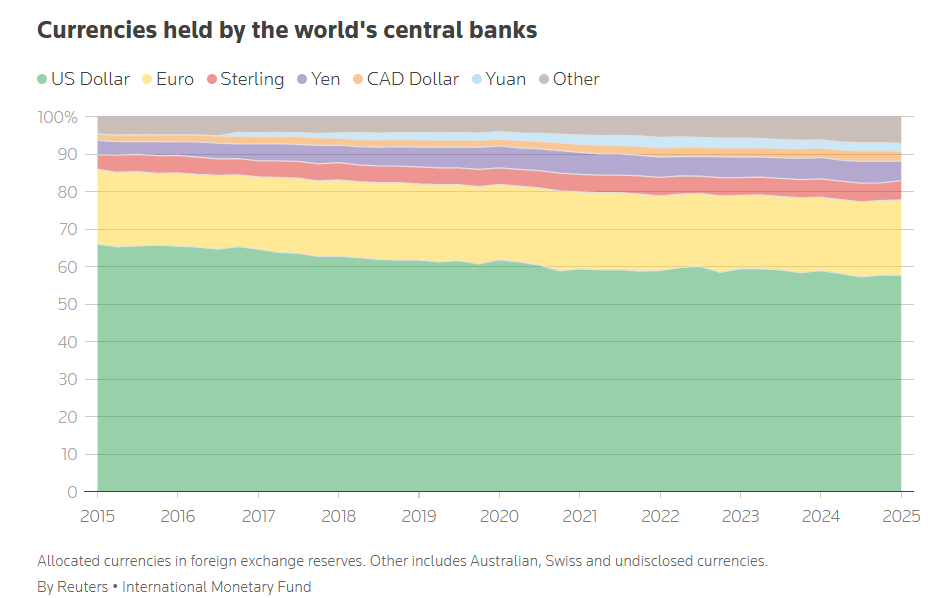 За даними звіту COFER (Currency Composition of Official Foreign Exchange Reserves), частка євро зросла з 19,8% до 20,1% — найвищого рівня з кінця 2022 року.