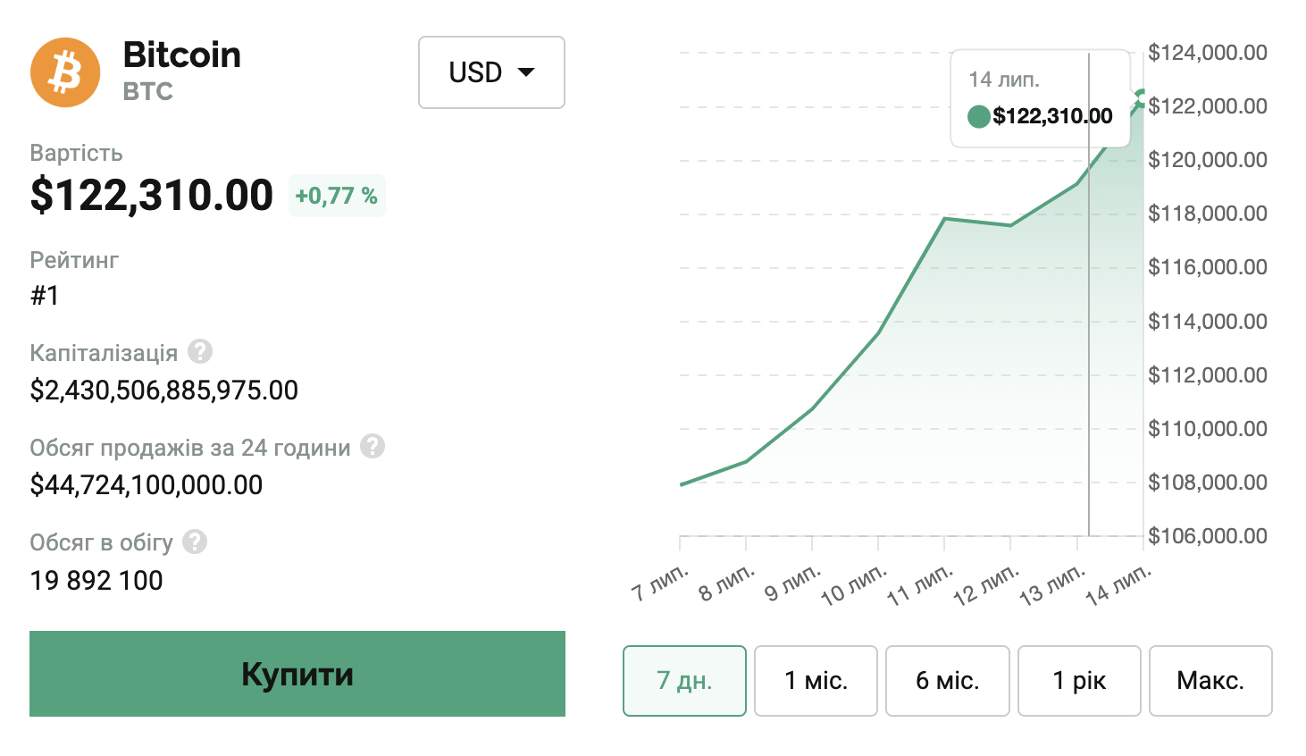 У ніч на 14 липня 2025 року ціна біткоїна в черговий раз за декілька днів встановила новий рекордний максимум (ATH). Перша криптовалюта зросла вище позначки в $122 600. На момент написання актив закріпився на позначці $122 310.