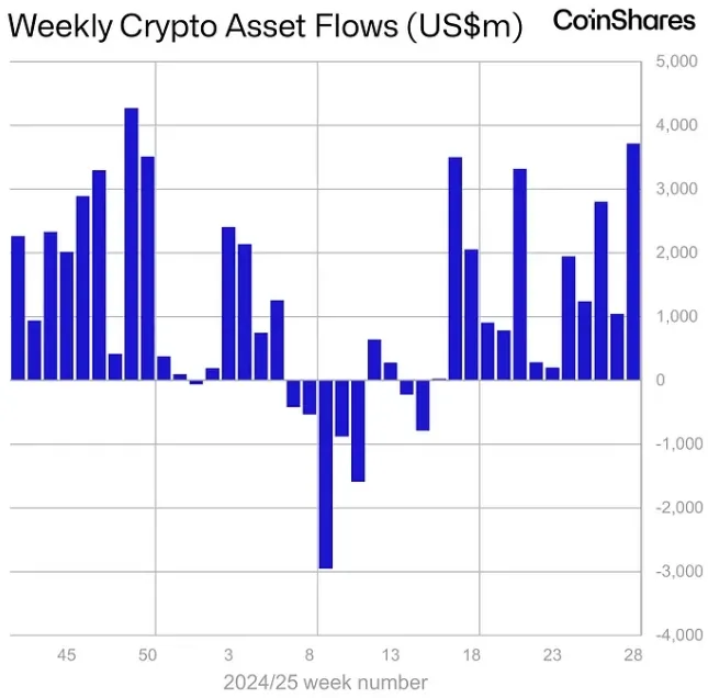 З 5 по 11 липня криптовалютні фонди залучили рекордні $3,7 млрд, що стало другим за величиною тижневим притоком в історії. Про це йдеться у звіті аналітичної компанії CoinShares. Попередній рекорд у $3,85 мільярда був зафіксований у грудні 2024 року.