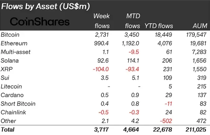 Цей звітний період став тринадцятим поспіль із чистим притоком коштів, що свідчить про стійкий інтерес інвесторів до криптоактивів. Сукупно за цей час у фонди надійшло $21,8 млрд, а з початку 2025 року загальний показник притоку досяг $22,7 млрд.
