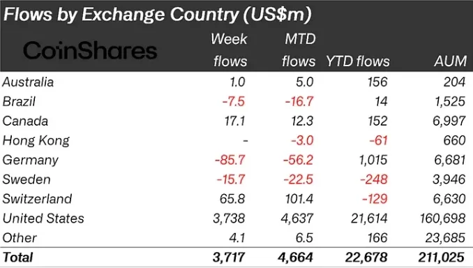 Найбільші надходження зафіксовані в США, де інвестори вклали $3,7 мільярда. У Німеччині спостерігався відтік у $85,7 млн. У Швейцарії та Канаді інвестори інвестували $65,8 млн та $17,1 млн відповідно.