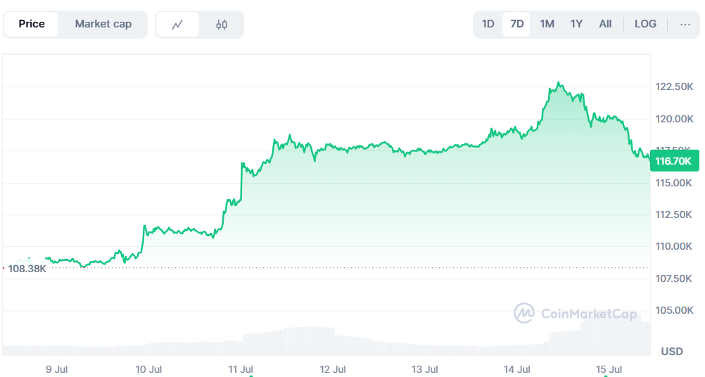 На момент написання новини ціна активу знизилась до 116 687. За добу біткоїн втратив в ціні майже 5%. При цьому за тиждень BTC зріс на 7,6%.