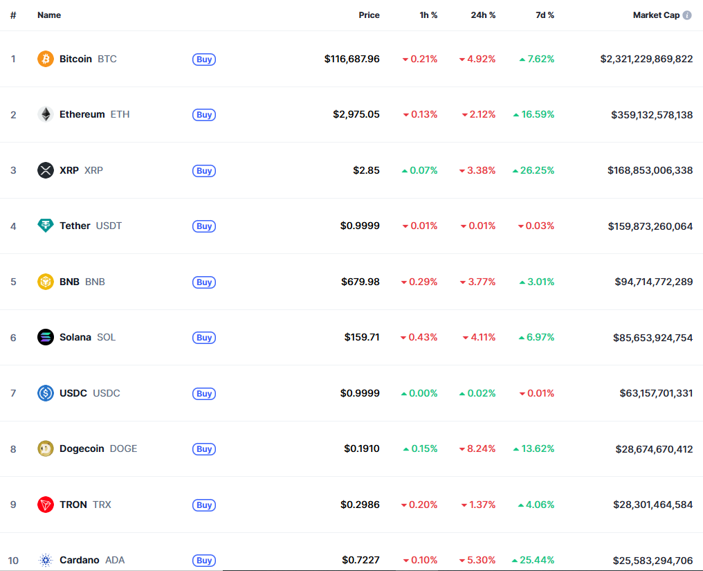Після чергового зростання біткоїна до нового максимуму у понад $122 тисяч вартість першої криптовалюти пішла вниз. Про це свідчать дані CoinMarkerCap.