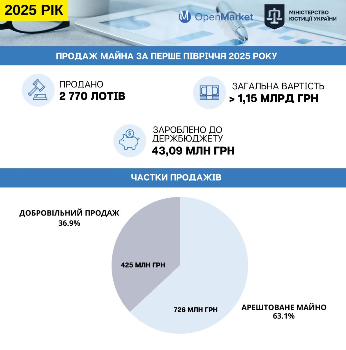 На електронному аукціоні OpenMarket (Міністерства юстиції) у першому півріччі було реалізовано майна на 1,15 млрд грн. За 6 місяців через систему проведено 2 770 успішних аукціонів. Завдяки конкуренції на торгах наші продавці додатково отримали понад 97,1 млн грн. Про це йдеться у повідомленні СЕТАМ.