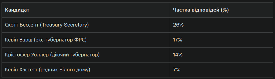 Згідно з результатами опитування, саме Скотт Бессент отримав найбільше згадок як потенційний наступник Пауелла. Інші можливі кандидати значно відстають у рейтингу очікувань, що свідчить про формування певного консенсусу серед учасників ринку.