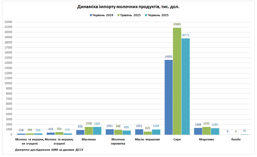 У червні 2025 року Україна імпортувала 4,46 тис. т молочних продуктів на суму 24,03 млн дол. Відносно травня 2025 року натуральні обсяги імпорту скоротилися на 12%, а відносно червня 2024 року збільшилися на 6,6%.