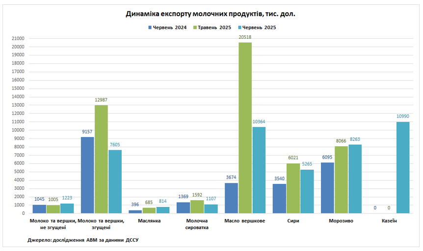 У червні 2025 року Україна наростила натуральні обсяги експорту маслянки до 506 т (+1%), морозива до 2,24 тис. т (+0,2%), молока та вершків, не згущених до 1,51 тис. т (+26%) відносно травня.