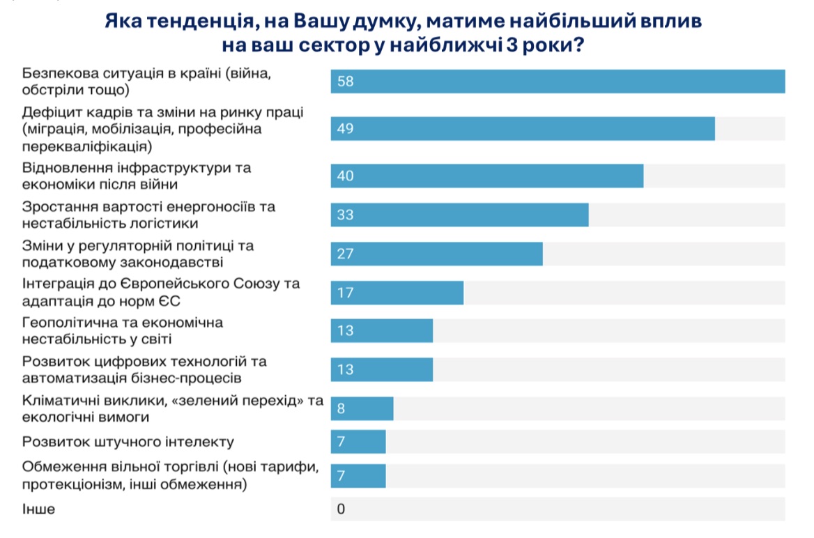 Підприємці очікують, що найбільший вплив на їх сектори у найближчі три роки матиме безпекова ситуація в Україні — фактор війни, обстрілів та загроз фізичній інфраструктурі зазначили 58% респондентів. Про це свідчать результати 38-го щомісячного опитування, яке провів Інститут економічних досліджень та політичних консультацій (ІЕД) у червні 2025 року серед 473 промислових підприємств.