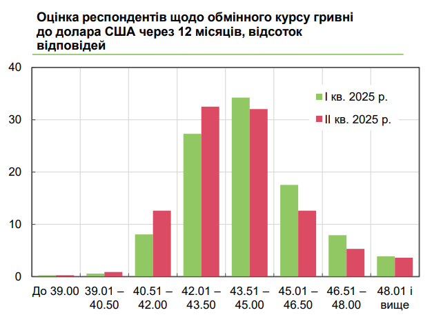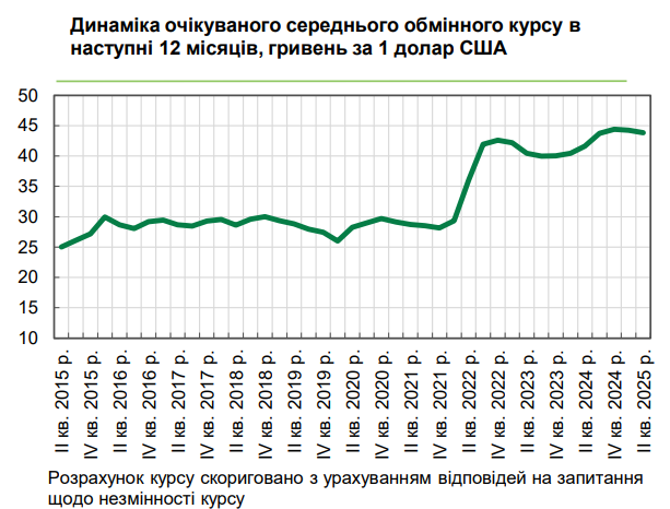 Керівники українських підприємств поліпшили свої курсові очікування другий квартал поспіль. Середнє очікуване значення обмінного курсу через 12 місяців — 43,84 грн/$ (у І кварталі 2025 року — 44,23 грн/$).