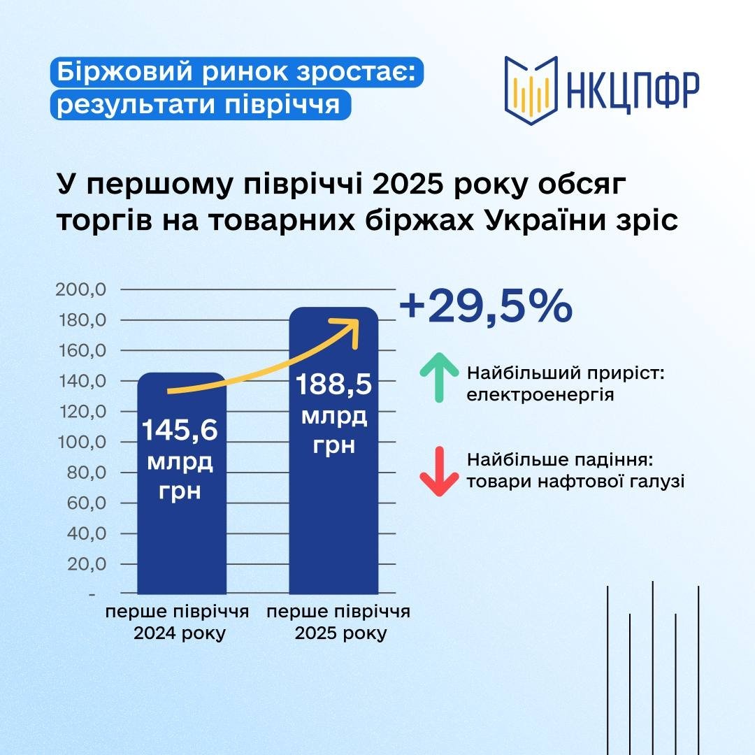 У першому півріччі 2025 року біржовий ринок України продемонстрував суттєве зростання. Обсяг торгів на товарних біржах сягнув 188,5 млрд грн, що на 29,5% більше, ніж за аналогічний період 2024 року (145,6 млрд грн).