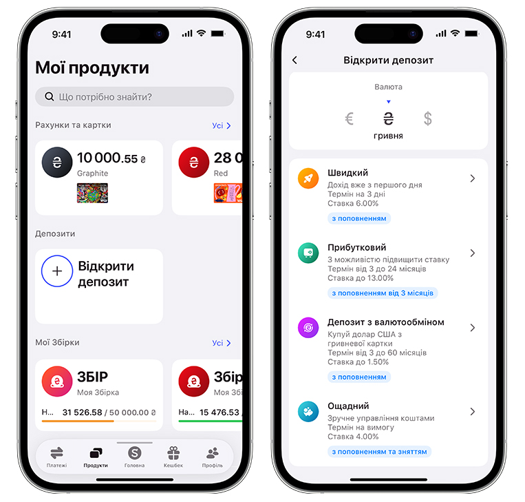 Sense Bank пропонує один із найширших онлайн-виборів депозитних продуктів. Через застосунок Sense SuperApp клієнт може обрати як класичні строкові вклади (наприклад, «Швидкий», «Прибутковий» або «Депозит із валютообміном»), так і вклади на вимогу — «Ощадний» або «Збірка». Останній особливо зручний для накопичення на конкретну мету.