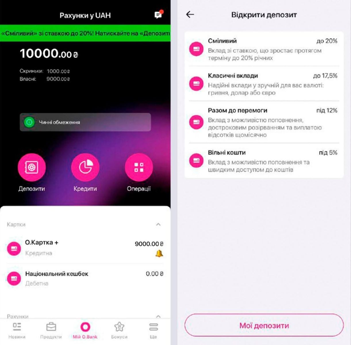 Мобільний O.Bank (АТ «Ідея Банк») пропонує широкий вибір депозитних продуктів, які можна оформити повністю онлайн. Усі вклади доступні через застосунок, без необхідності йти до відділення. А для нових клієнтів діють спеціальні акційні умови.
