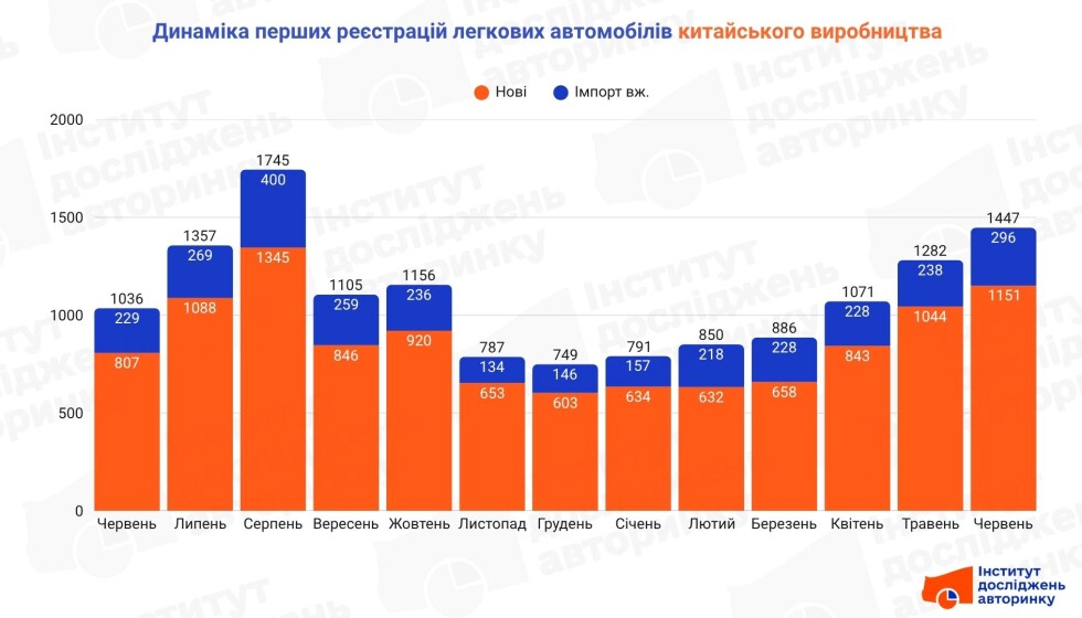 У першому півріччі 2025 року українці зареєстрували понад 6,3 тисячі нових і вживаних авто китайського виробництва. Найвищий показник зафіксовано у червні — 1447 реєстрацій, із яких понад тисяча припала на нові машини. Про це йдеться в даних Інституту досліджень авторинку.
