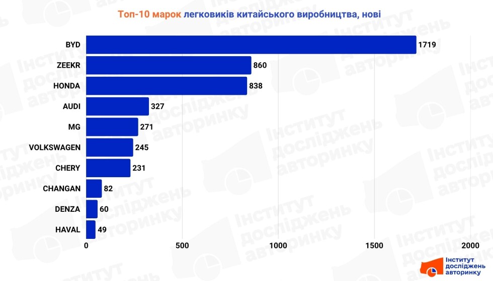 Абсолютним лідером стала марка китайського автогіганта з Шеньчжені BYD — 1719 зареєстрованих машин. Далі — Zeekr (860 шт.) і Honda (838 шт.), яка хоч і японська за походженням, активно збирає окремі моделі в Китаї.