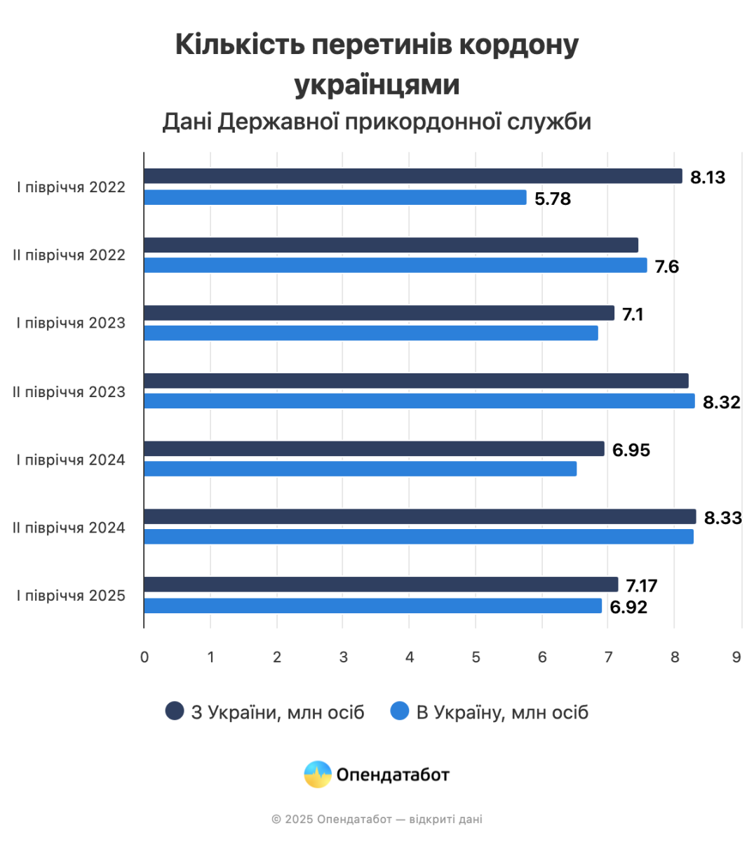 16,47 млн перетинів державного кордону зафіксовано за 6 місяців 2025 року. Це на 4% більше, ніж за той самий період торік. Про це йдеться в даних Опендатабот.