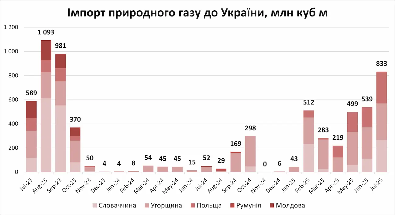 В липні 2025 року обсяги імпорту природного газу до України зросли до найвищого рівня за майже два роки з вересня 2023 року, досягнувши 833 млн куб м. У порівнянні з червнем (539 млн куб м) обсяги імпорту зросли у 1,5 раза, а у порівнянні з липнем 2024 року (52 млн куб м) — у 16 разів. Про це свідчать дані ExPro.
