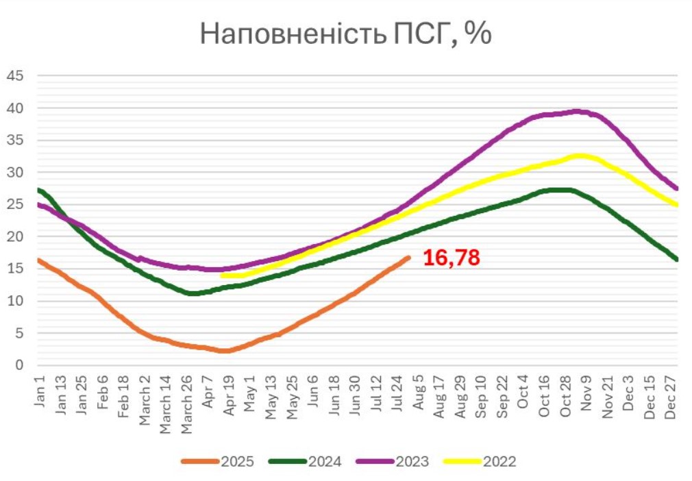 У підземних газових сховищах на 31 липня знаходилось 5,05 млрд куб. м активного газу (або 9,65 млрд куб. м з урахуванням 4,6 млрд куб. м активного газу, що виконує функцію буферного та не підлягає відбору). Рівень наповненості ПСГ — 16,78% (на цю дату у 2024 було 20,44%, у 2023 — 25,18%).