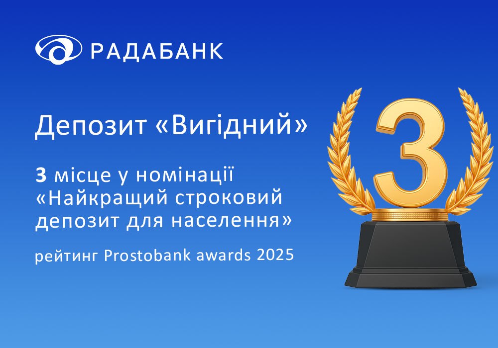 Депозитна програма «Вигідний» від Радабанку здобула 3 місце у рейтингу Prostobank Awards 2025 у номінації «Найкращий строковий депозит для населення».