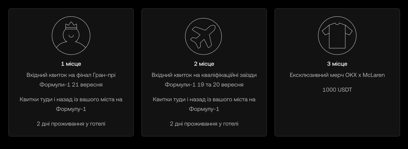 У рамках глобальної кампанії OKX пропонує всім користувачам шанс виграти поїздку на Гран-прі Формули-1. Для цього необхідно активно торгувати: призи за перше та друге місця отримають ті учасники, які досягнуть щонайменше 10 000 000 USDT торгового обсягу, а третє місце передбачає винагороду за обсяг від 5 000 000 USDT. Кампанія триває до 24 серпня 2025 року.