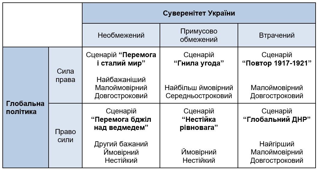 Завершення війни — це розгорнутий спектр варіантів, де між двома крайніми малоймовірними лежить низка проміжних, серед яких є досить імовірні, — і треба розуміти їхні переваги, недоліки й межу прийнятності. Так само й тимчасове припинення війни — перемир'я — може бути зафіксоване у різних варіантах. Про різні сценарії завершення війни пишуть викладач Києво-Могилянської бізнес-школи Валерій Пекар та засновник групи компаній Advanter Group та міжнародної бізнес-спільноти Board Андрій Длігач.