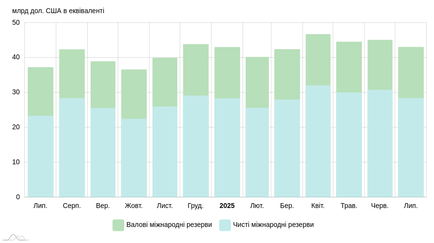 За даними Нацбанку, за липень 2025 року міжнародні резерви України знизилися на 4,5% і на 1 серпня склали $43,031 млрд. Серед головних причин такої динаміки регулятор назвав: