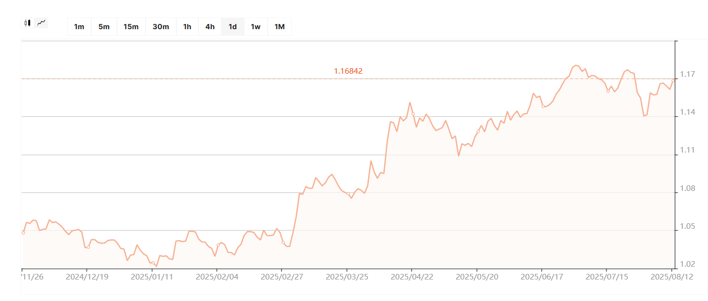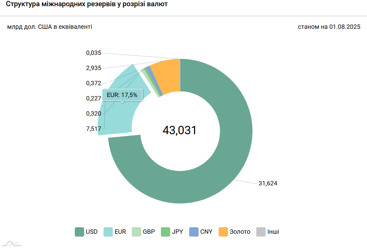 Фактично за приблизно однакового обсягу ЗВР на початок року та 1.08.2025 (у межах $43−44 млрд) частка євро помітно зросла. Якщо на 1 січня питома вага євровалюти в резервах була 6,8%, то на 1 серпня — вже в 2,57 раза більша — 17,5%. А в абсолютних сумах це у доларовому еквіваленті майже $3 млрд на 1 січня і вже близько $7,5 млрд на 1 серпня цього року.