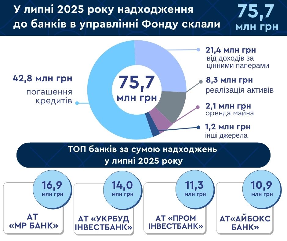 З цих коштів 42,8 млн грн банки отримали від погашення кредитів. Також 21,4 млн грн надійшло до банків в управлінні Фонду від доходів за цінними паперами. Ще 8,3 млн грн склали надходження від реалізації активів, 2,1 млн грн — від оренди майна та 1,2 млн грн — з інших джерел.