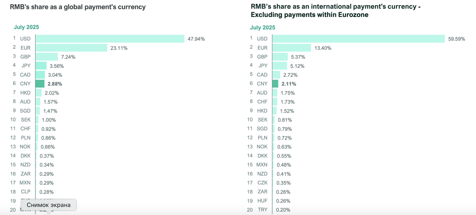 Найбільшим розчаруванням для амбіцій Пекіна стала динаміка китайського юаня: його частка в міжнародних розрахунках зберігається на рівні 2,88% — це найнижчий показник за останні два роки.