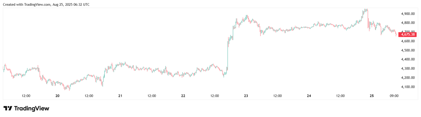 Увечері 24 серпня 2025 року курс Ethereum (ETH) оновив історичний максимум (ATH), досягнувши в моменті позначки $4956, згідно з TradingView. Після цього ціна відкотилася, пише incrypted.