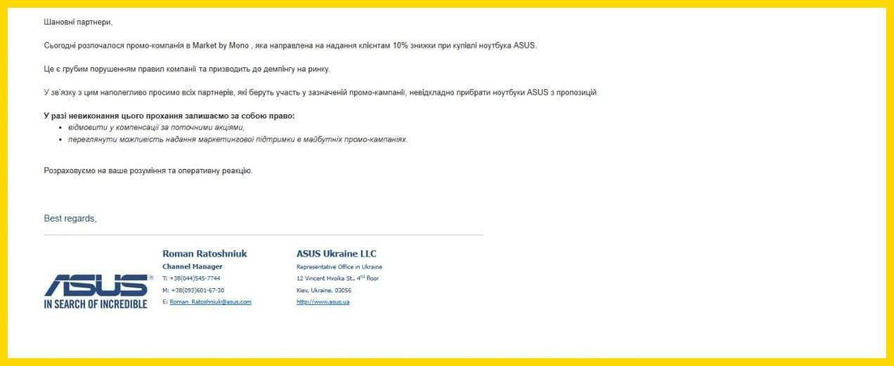 Також у новину додали скріншот листа, в якому представник фірми ASUS просить прибрати ноутбуки компанії з акційних пропозицій, оскільки це є грубим порушенням правил компанії та призводить до демпінгу на ринку.