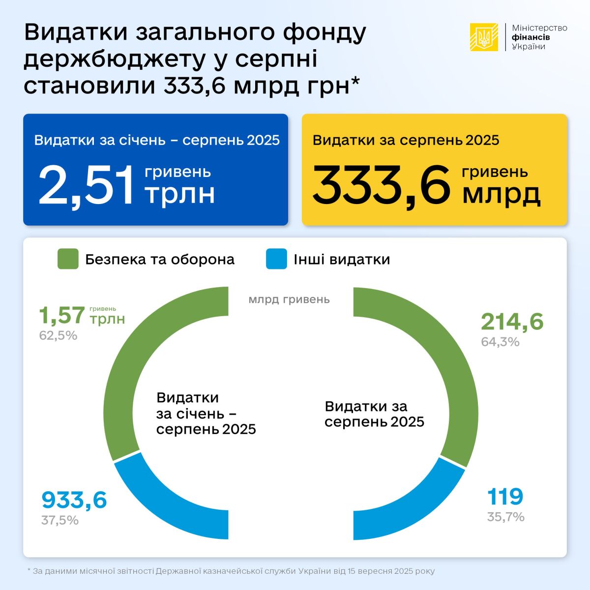 Видатки загального фонду державного бюджету на безпеку і оборону за січень — серпень 2025 року становили 1,57 трлн грн, або 62,5% від усіх видатків загального фонду. У тому числі у серпні було витрачено 214,6 млрд грн.