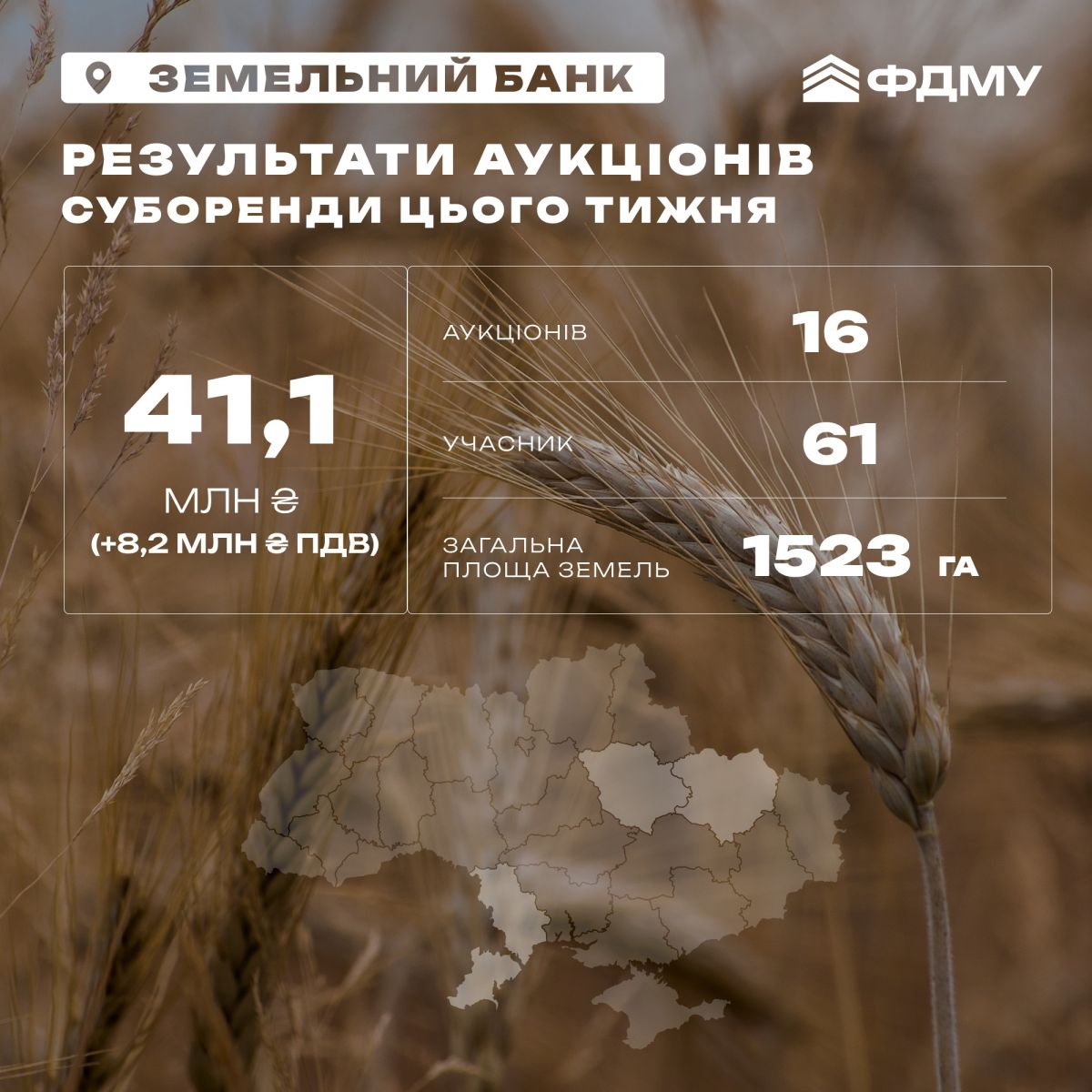У результаті 16 торгів через систему «Prozorro.Продажі» держава здала в суборенду 1 523 га землі. Середня вартість суборенди одного гектара склала 27 019 гривень. Ділянки розташовані в Харківській, Одеській та Полтавській областях.