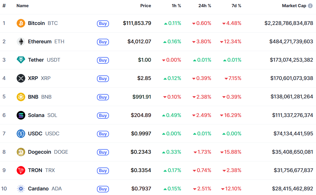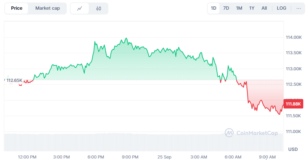 Уранці 25 вересня криптовалютний ринок знову переживає корекцію. Курс біткоїна опустився нижче $112 000, а Ethereum — нижче позначки $4 000. Про це свідчать дані CoinMarketCap.