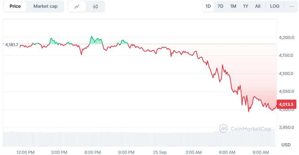 Ethereum в моменті знизився до $3 993, але потім зріс до $4 012. За добу актив втратив 3,80%, за тиждень — 12,34%.