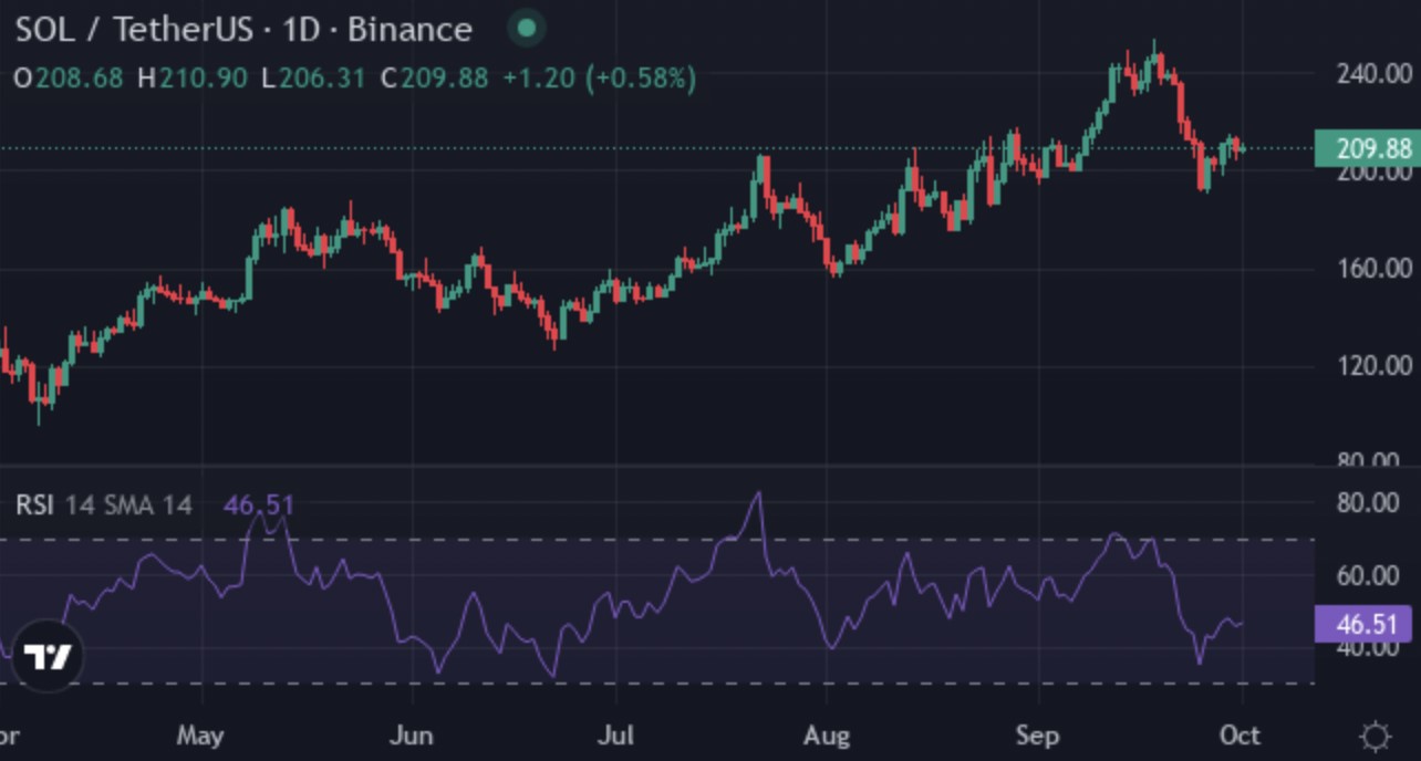 SOL охолоджується після тривалого спринту. За останній тиждень монета впала на 1,66%, але все ще демонструє зростання на 4,52% за 1 місяць і значний стрибок на 79,01% за 6 місяців. Поточний діапазон знаходиться між 189 і 235 доларами, що трейдери розглядають як паузу, а не пік.