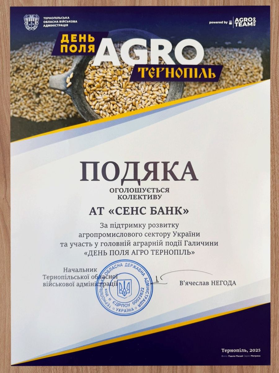 Під час заходу Sense Bank отримав подяку за підтримку розвитку агропромислового сектору України від Голови Тернопільської обласної військової адміністрації В’ячеслава Негоди.